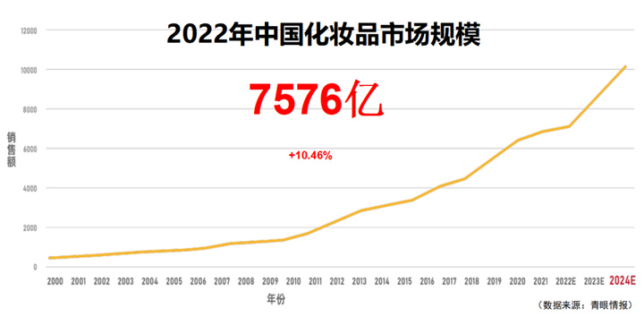 丁总指出,万亿美妆在中国,我国美妆市场规模近年来呈现较快增长态势,仅2022年中国化妆品市场规模达到7576亿。